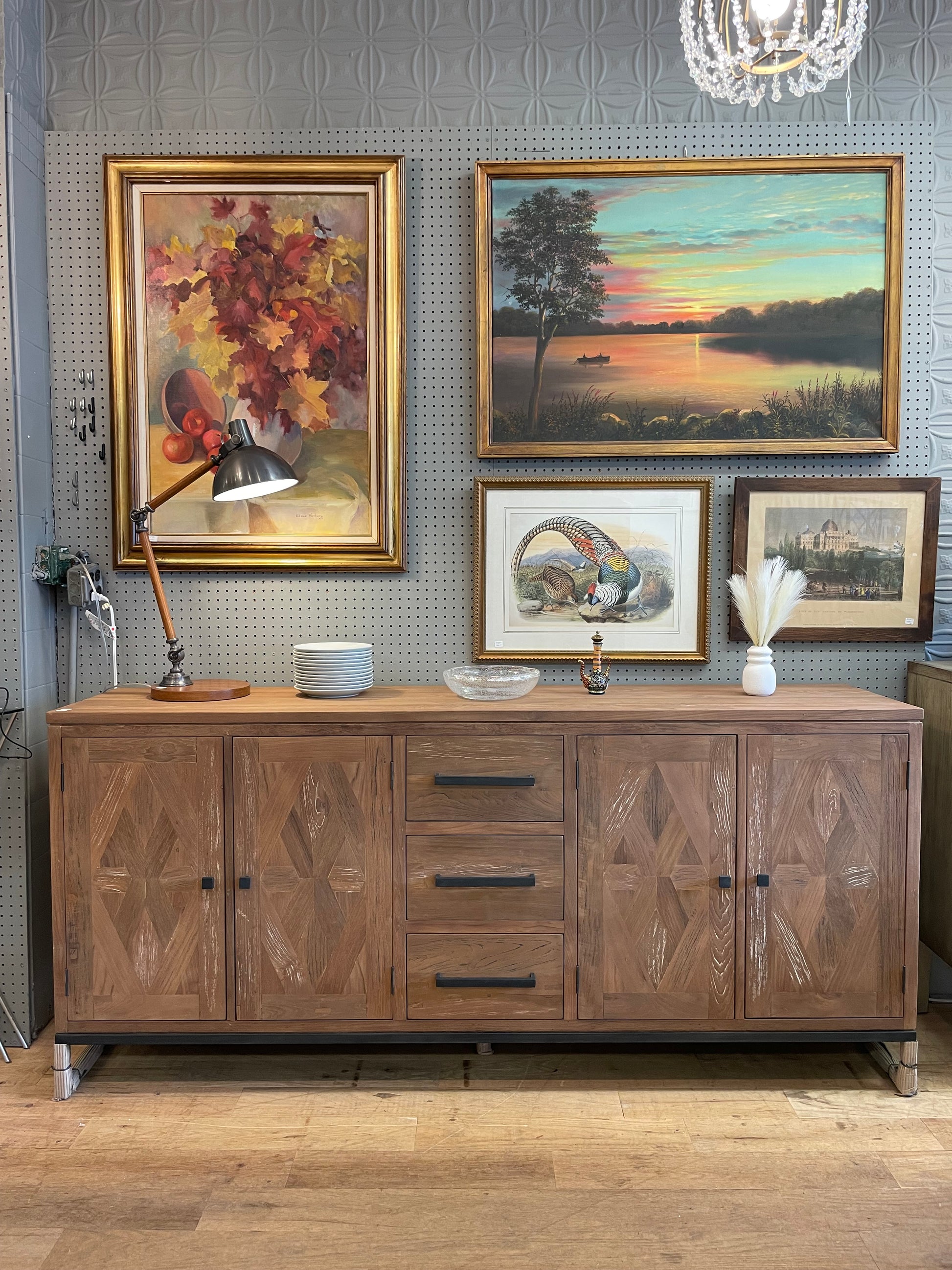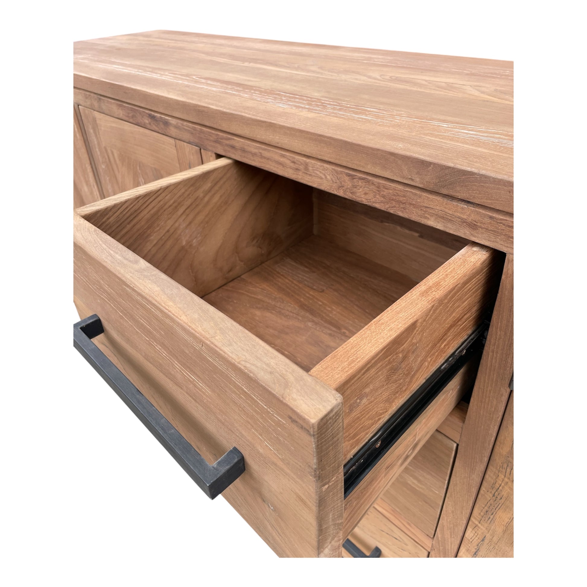 The New Mozaic sideboard, crafted from recycled teak, features a unique mosaic design that integrates environmental sustainability with functional design. It offers four spacious doors and three drawers, providing ample storage space while enhancing interior aesthetics. The use of recycled materials contributes to reduced environmental impact by 30%.