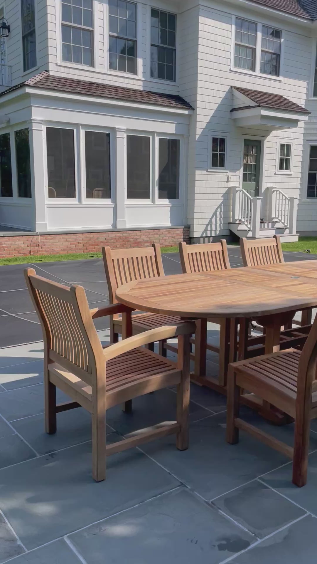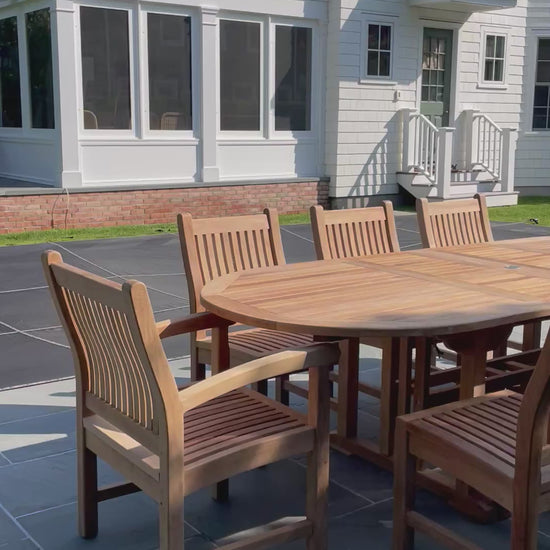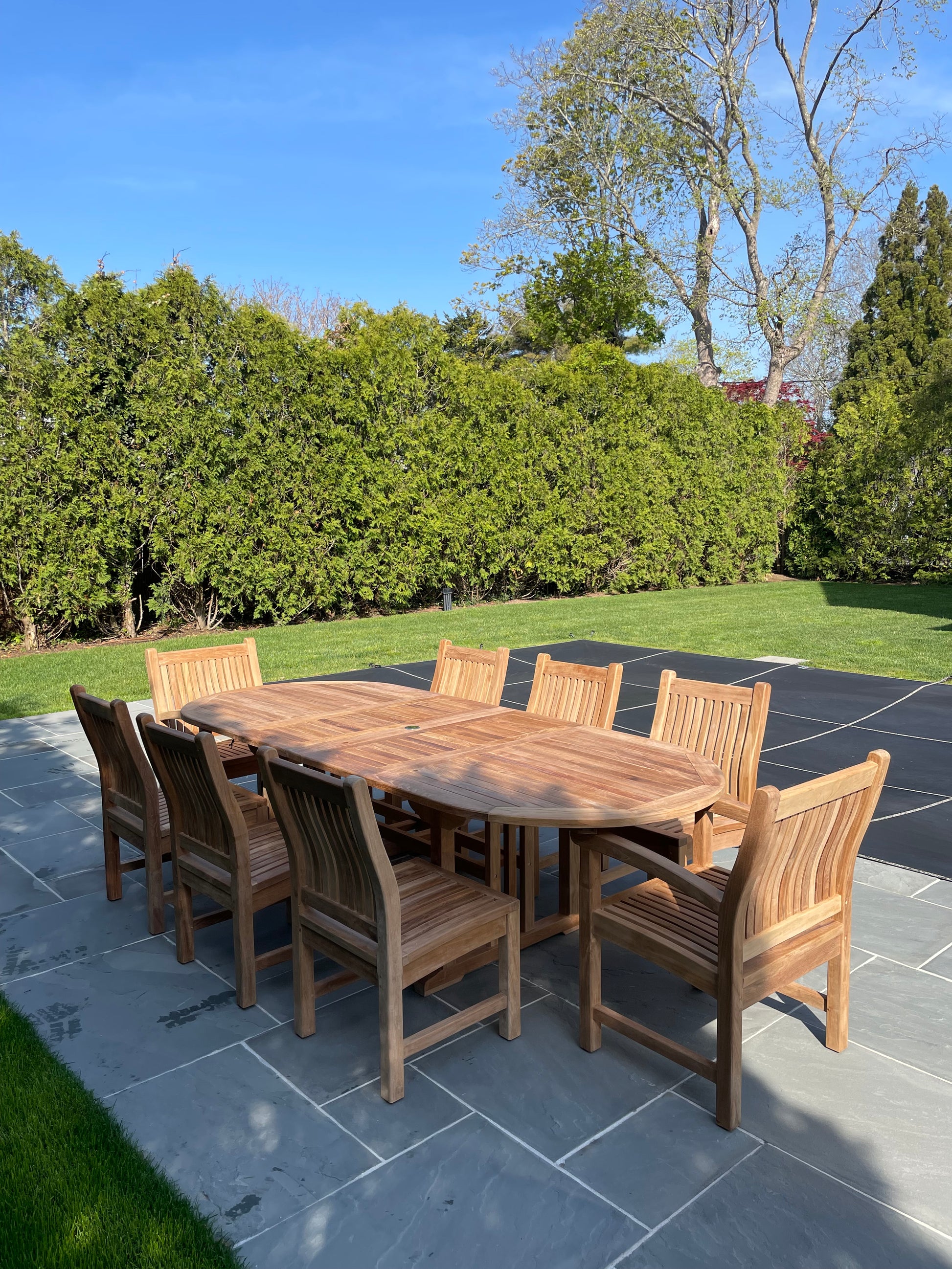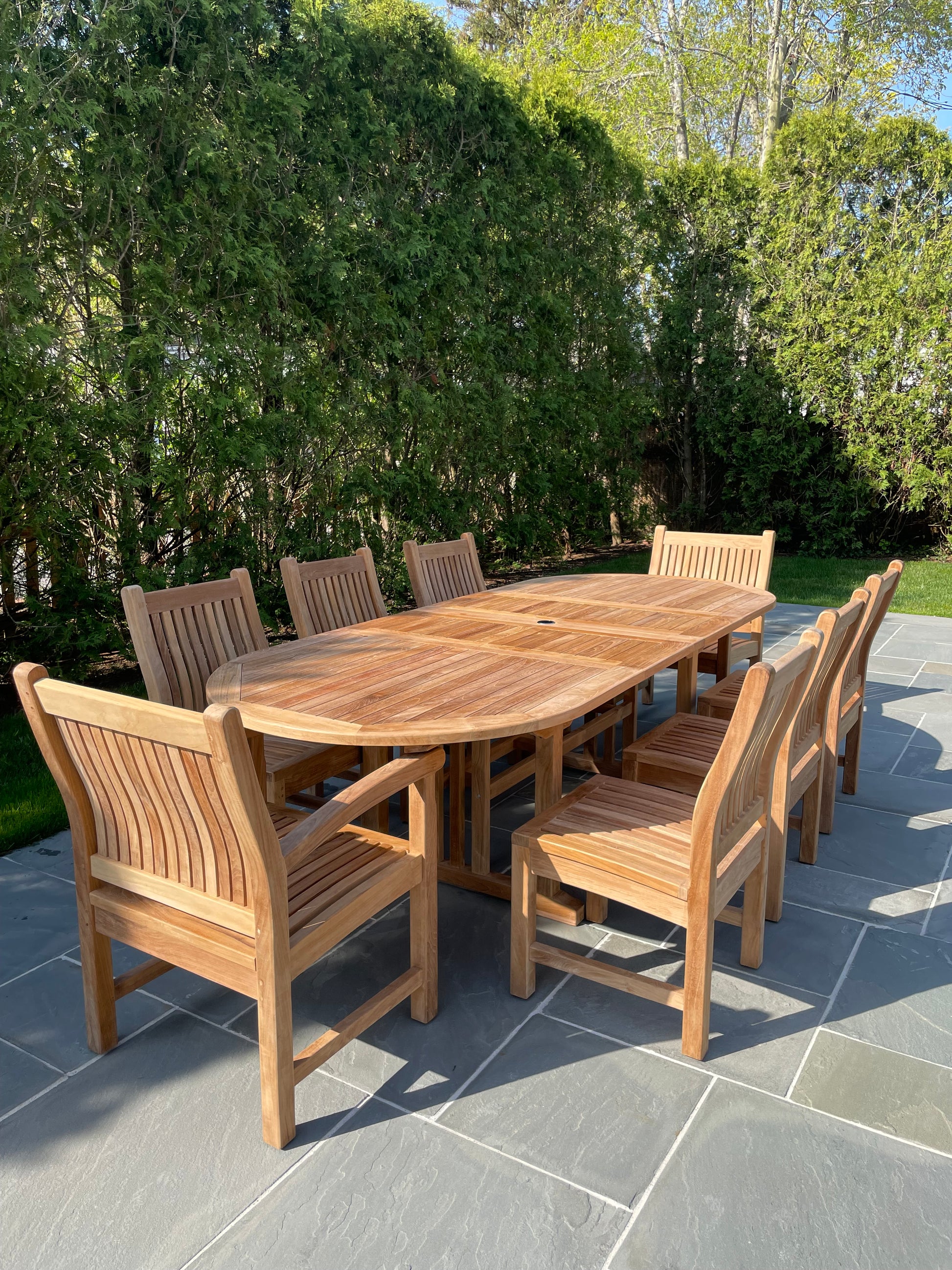 The nine-piece teak dining set brings clean, timeless style. Solid Grade A Teak direct from Indonesia. This oval table with two leaves, seats eight comfortably. Eight sturdy chairs, weather-proof, low-maintenance, and built to age beautifully. Simple elegance for your space.
